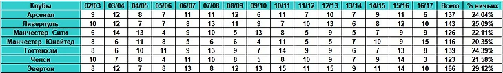 Таблица 4: Количество ничьих  в чемпионатах 2002/03-2016/17