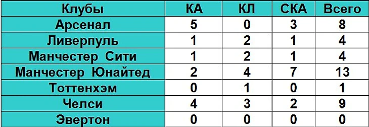 4. 5 клубов выигрывали Кубок и Суперкубок Англии: «Арсенал», «Ливерпуль», «Манчестер Сити», «Манчестер  Юнайтед» и «Челси»