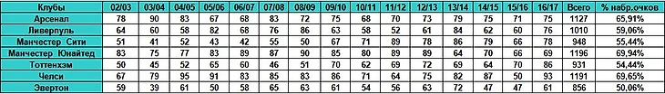 2. «Big Four» («Арсенал», «Ливерпуль», «Манчестер  Юнайтед», «Челси») набрали более 60% очков в чемпионате
