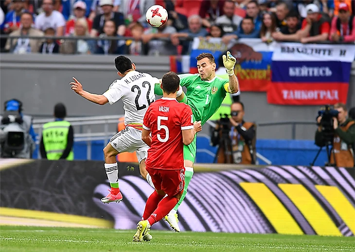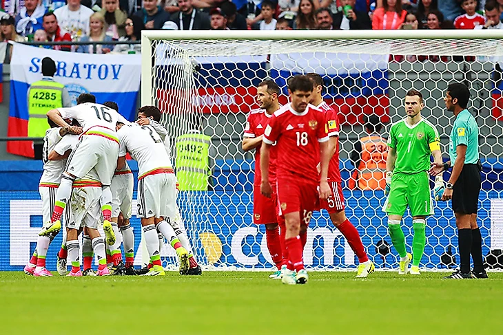 На первых минутах тренер мексиканцев положил на угол технической зоны блокнот и чехол с очками. При каждом опасном моменте Хуан Карлос Осорио садился на корточки и что-то лихорадочно писал. В первые 10 минут в блокноте наверняка чаще всего мелькала фамилия Zhirkov. Юрий заставил стадион злобно засвистеть, когда рухнул в штрафной мексиканцев – то ли сам, то ли после контакта с ногой защитника. Еще неделю назад Казань раздражали видеоповторы, а теперь она рьяно просила пенальти. Арбитр Фахад Аль-Мирдаси не реагировал, а через минуту все тот же Жирков спас Россию от гола уже в своей штрафной.