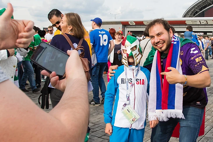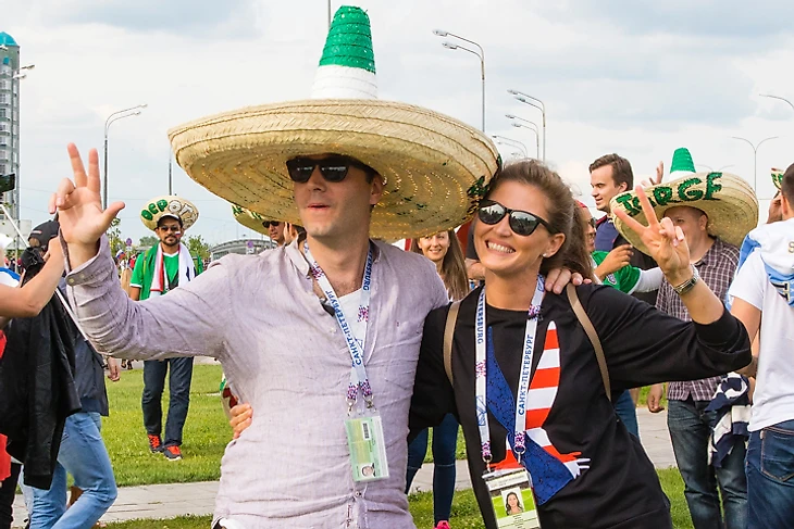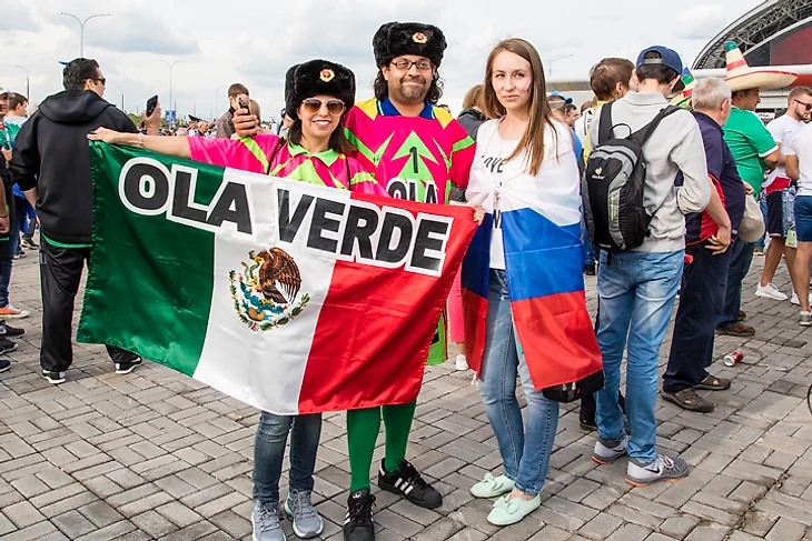 Влезть в чужой эфир – одно из главных развлечений фанатов перед матчем. Наши радостно размахивали флагами и по-русски вещали рядом с записывавшими стенд-ап мексиканцами. Любители текилы действовали аккуратнее: подкрадывались к дающим интервью и растягивали зелено-бело-красный флаг за их спинами.