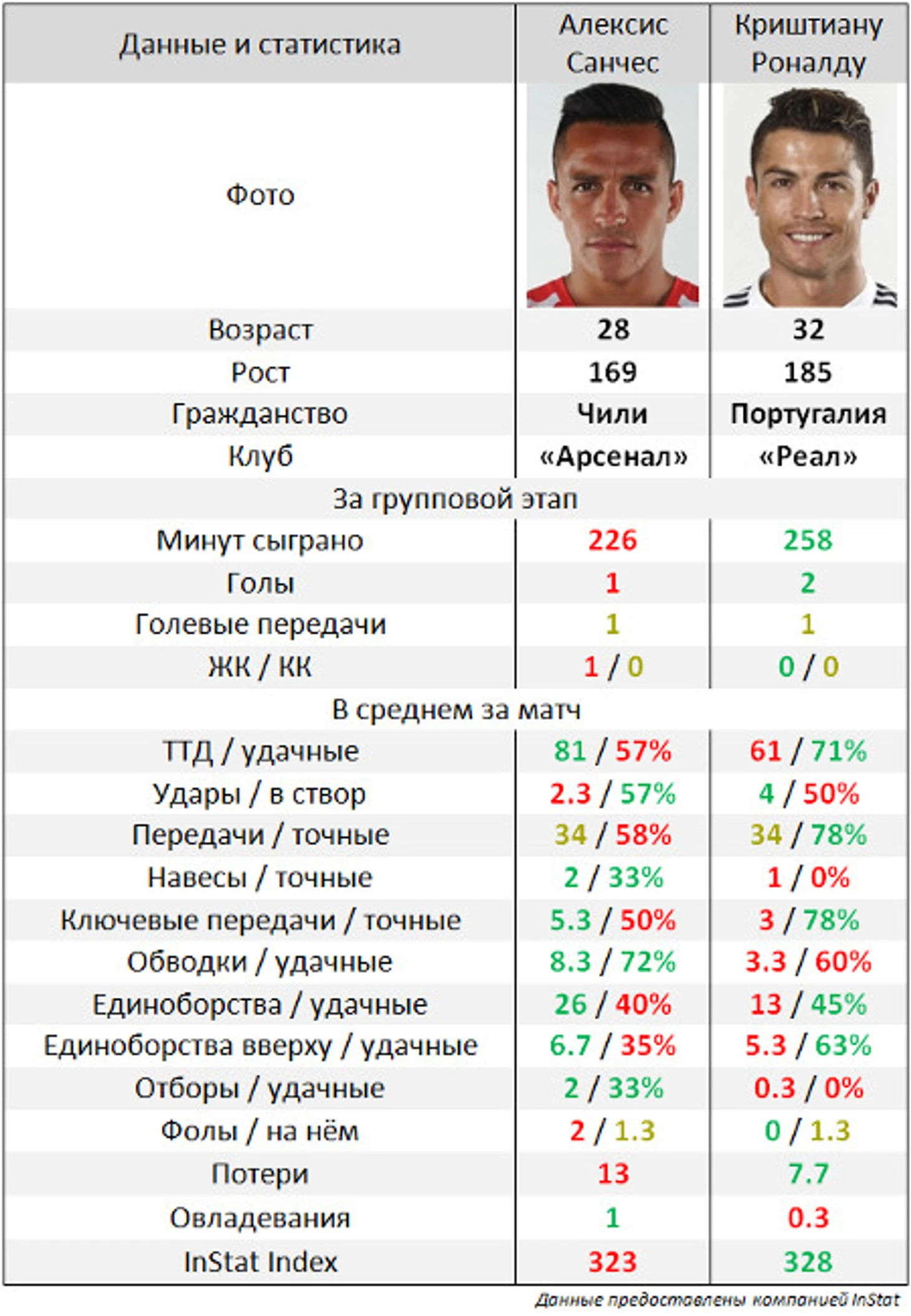 Прежде всего, обращает на себя внимание тот факт, что Алексис бьёт Криштиану количественно, выполняя больший объём работы, в особенности оборонительной. Португалец це на это отвечает качеством игры, выраженном в более высоком проценте успешных действий. Ну а вообще, стата перед вами. Ведь что наша жизнь? Цифирь!