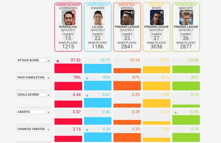 Как видно из таблицы сравнения игроков на портале Squawka, турок обошел Хамеса Родригеса, Месута Озила, Кевина Де Брюйне и Деле Алли по показателю средней полезности в атаке за 90 минут матча.