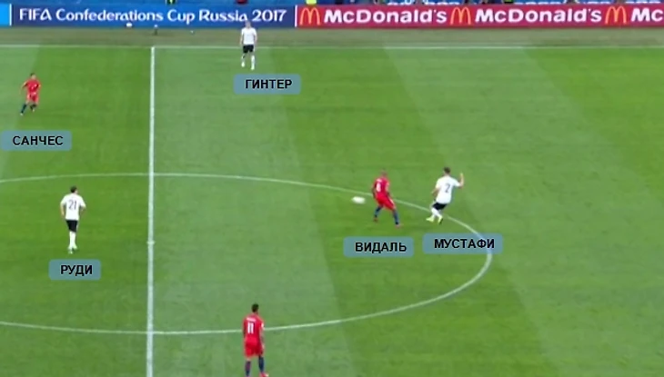 Шкодран Мустафи, вернувшийся в сердце обороны после отдыха в полуфинале, не использует неправильное расположение Алексиса Санчеса и вместо паса Маттиасу Гинтеру поспешно заигрывает Ларса Штиндля, чей корпус в невыгодном положении для разворота. Игроки «ла рохи» выцарапают у него мяч.