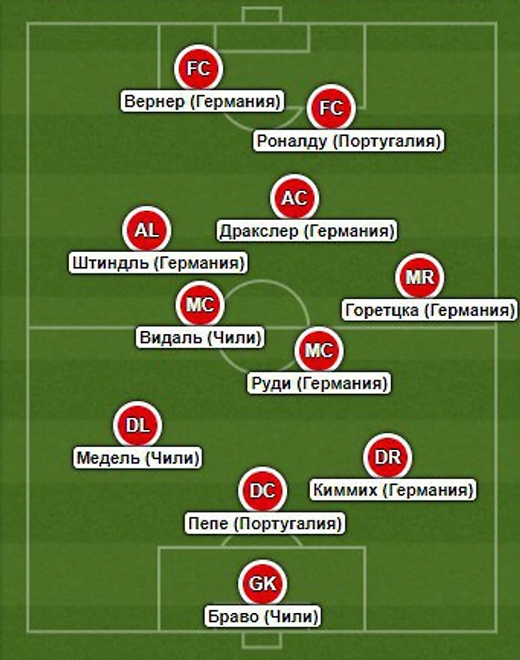 Германия прибавила в дисциплине, не ломала защитную структуру на расслабоне, как это случалось в полуфинале с Мексикой, и легко отбивалась от навесов с фланга. Причём лишь с одного, ибо Жан Босежур в игру не попал и в зоне ответственности двух умниц Штиндля и Йозуа Киммиха пропал, как в бермудском треугольнике. Исла же сбивался на простые решения, поливая штрафную кроссами с очень отдалённых от лицевой линии позиций. Форварды Чили выиграли за весь матч только два верховых единоборства и не создали таким образом никакой угрозы.