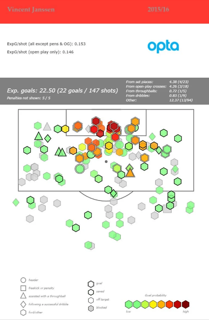 Карта ударов и ожидаемых голов Янссена в чемпионате Голландии от @mixedknuts