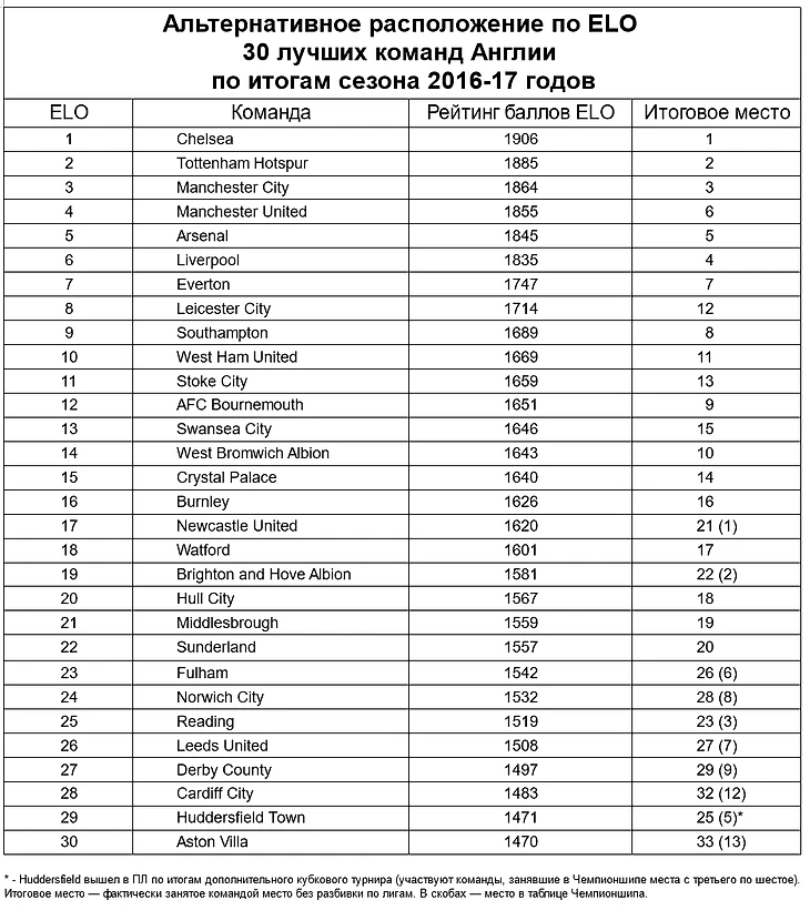 Сайт talkSPORT опубликовал рейтинг ELO для тридцати лучших английских клубов по итогам прошедшего сезона. Вот что получилось.