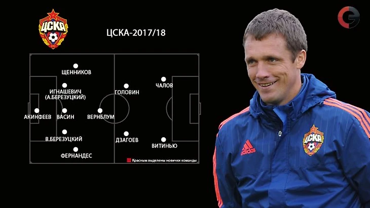 Гончаренко с приходом в ЦСКА сразу поменял схему с 4-5-1 на 3-5-2 с тремя центральными защитниками и двумя бровочниками, способными закрыть весь фланг. В случае отсутствия травм за опорную зону будет отвечать Вернблум или Натхо, а за креатив – Головин и Дзагоев. Основными нападающими видится пара Чалов – Витиньо. Возможно, особая роль будет уготовлена молодому Чернову – ведь карьеры Игнашевича и Березуцких не вечны.