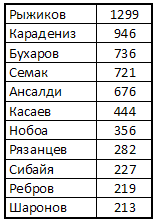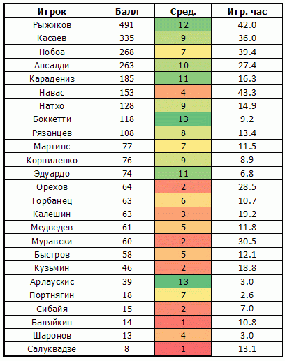 В первой колонке приведена сумма «процентных вкладов» за все 30 игр. Во третьей колонке дано количество часов, проведённых на поле. Во второй колонке даны частные от деления суммы процентов на игровое время, т.е. средняя скорость зарабатывания баллов игроком. По абсолютному количеству баллов в этом сезоне удалось особенно выделиться Рыжикову, Касаеву и Нобоа с Ансалди хребет команды.