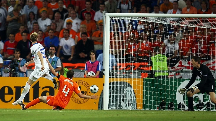 Без сомнения самый яркий матч сборной России в XXI веке. Он заставил всю страну пережить незабываемые мгновения триумфа и гордости за свою страну. Ради просмотра того поединка по телевизору, мне пришлось пожертвовать собственным выпускным, с которого я сбежал сразу же после торжественной части. Впоследствии о своём поступке я не пожалел ни на секунду. Но обо всём по порядку. Перед началом поединка в успех наших футболистов практически никто не верил. И это не удивительно, ведь голландцы, на групповом этапе, показывали самый искромётный футбол среди всех участников того памятного Евро. Они просто катком давили своих соперников, не замечая сопротивления. Причём, на групповой стадии, оранжевые разгромили французов и итальянцев. А в последнем туре, смешанным составом, уверенно переиграли сборную Румынии. Матч получился одним из самых зрелищных на турнире. На двоих соперники за 120 минут нанесли по воротам друг друга более 50! ударов. Причём на счету россиян их было 26 (11 в створ). Наша сборная не только победила, она переиграла классного соперника с великолепным подбором игроков. За счёт быстрых атак наши футболисты много раз ставили в тупик оборону маститого соперника и должны были решать исход поединка ещё в основное время. Однако на гол Павлюченко, под занавес матча сумел таки ответить Рууд ван Нистелрой. Концовка же матча получилась просто фееричной. Здесь было и отменённое удаление Дениса Колодина и удар Павлюченко в перекладину и опасные моменты после ударов Аршавина и Торбинского. В начале второго дополнительного тайма у Любоша Михела были основания назначить пенальти в ворота Голландии за толчок в спину Жиркова, но свисток судьи промолчал. И всё-таки наши додавили оранжевых. Вначале Торбинский буквально влетел в ворота голландцев вместе с мячом, а затем Аршавин ушёл от Ойера и пробил рикошетом от Хейтинги в угол ворот ван дер Сара. 3:1 – Россия побеждает и выходит в полуфинал.