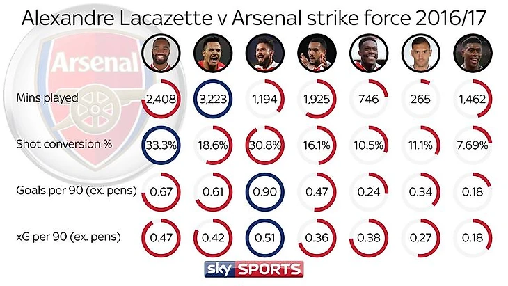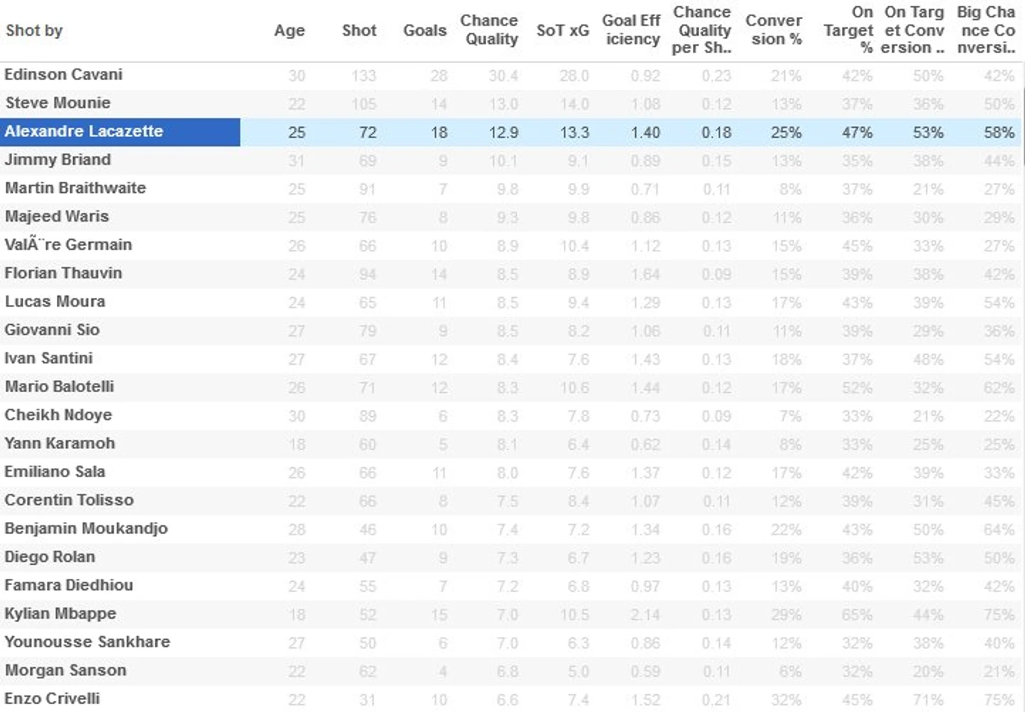 Лучший путь поиска игрока в такую систему – просто взять того, кто много и стабильно забивает. В идеале за его результативностью стоит хорошая статистика ударов. Ляказетт вписывается в этот шаблон.