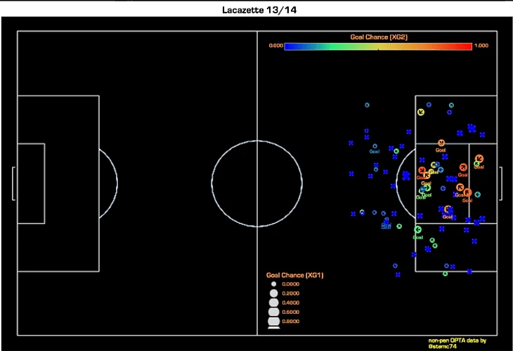 Профиль ударов Алекса хорошо накладывается на то, как «Арсенал» строит атаки. В последние два сезона «Арсенал» наносил наибольший по лиге процент от всех ударов из штрафной. Ляказетт стремиться максимизировать количество ударов из центральной зоны штрафной.