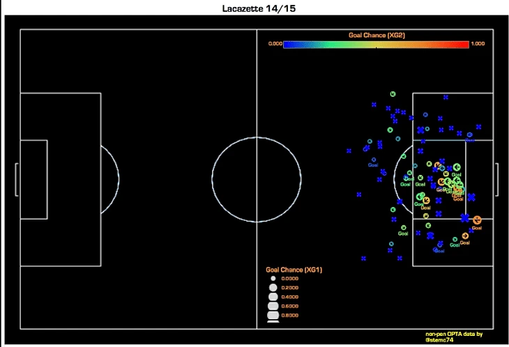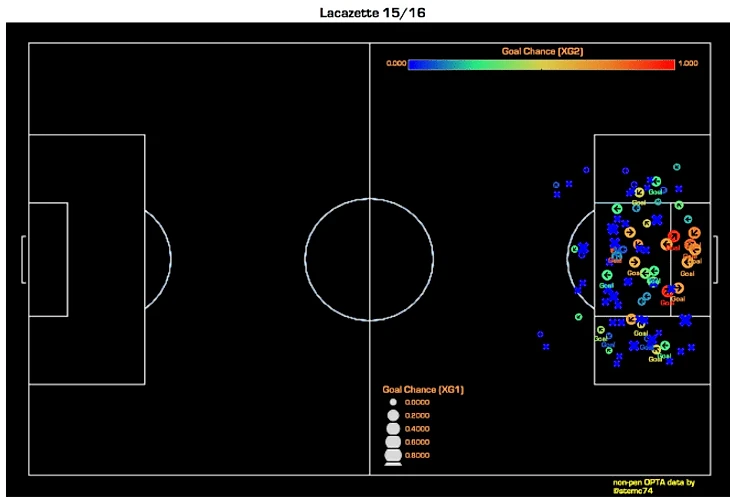 4 года подряд Ляказетт забивает более 20 голов с игры за сезон. Результативность не переносится напрямую из лиги в лигу и из сезона в сезон, так как зависит не только от уровня игрока, но и от дополнительных факторов, от реализации до стиля команды. Но у игрока, чья результативность подкрепляется количеством и качеством ударов, намного больше шансов перенести свою результативность (речь о результативности с игры – важно в случае Ляказетта, который забил 10 пенальти в Лиге 1 за последний сезон).