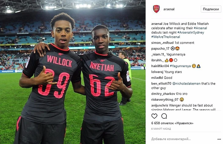Официальный аккаунт «Арсенала»: «Джо Уиллок и Энди Нкетиа отмечают после своих дебютов за первую команду Арсенала прошлым вечером».