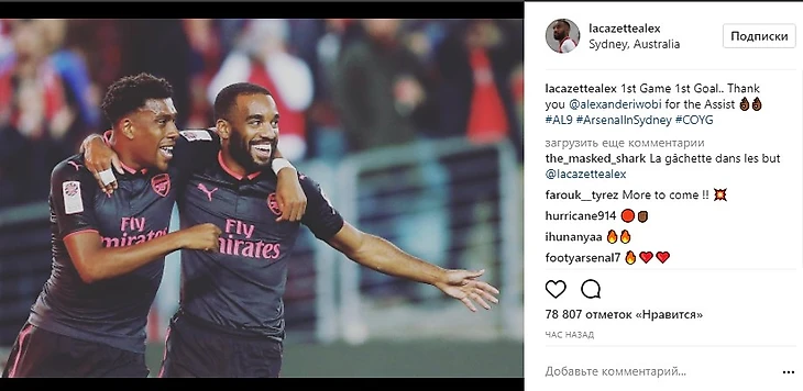 Немного ниже вы увидите снимок радостного новичка команды, празднующего свой первый забитый гол за «Арсенал» в дебютном матче. Несмотря на то, что он товарищеский, футболисты и болельщики не приуменьшают его значимости. Ляказетт в привычной манере поблагодарил своего первого «канонира»-ассистента, упомянув его в описании. 9 дней назад Александр опубликовал свой первый портрет в красно-белом стиле, и в его используемых тэгах теперь значительно чаще фигурирует #COYG.