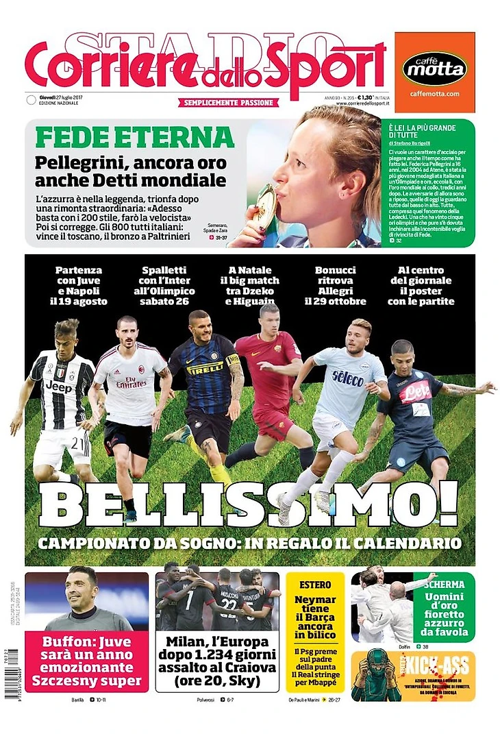 Чемпионат мечты: календарь в подарок. Начало с «Юве» и «Наполи» 19 августа. Спаллетти с «Интером» на «Олимпико» в субботу 26. На Рождество топ-матч между Джеко и Игуаином. Бонуччи вновь встретится с Аллегри 29 октября. В центре газеты постер с матчами.