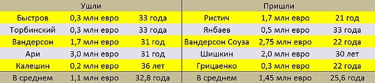 Основные тренды заметны невооруженным взглядом. Это омоложение состава, увеличение продажной стоимости игроков и разгрузка зарплатной ведомости. Средний ценник на ушедших из команды игроков – 1,1 млн евро, возраст – 32,8 года. Средний ценник пришедших – 1,45 млн евро, возраст – 25,6 года.