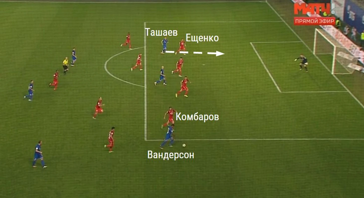 Вандерсон выполняет кросс без помех, а Ташаев успевает опередить соперников во вратарской