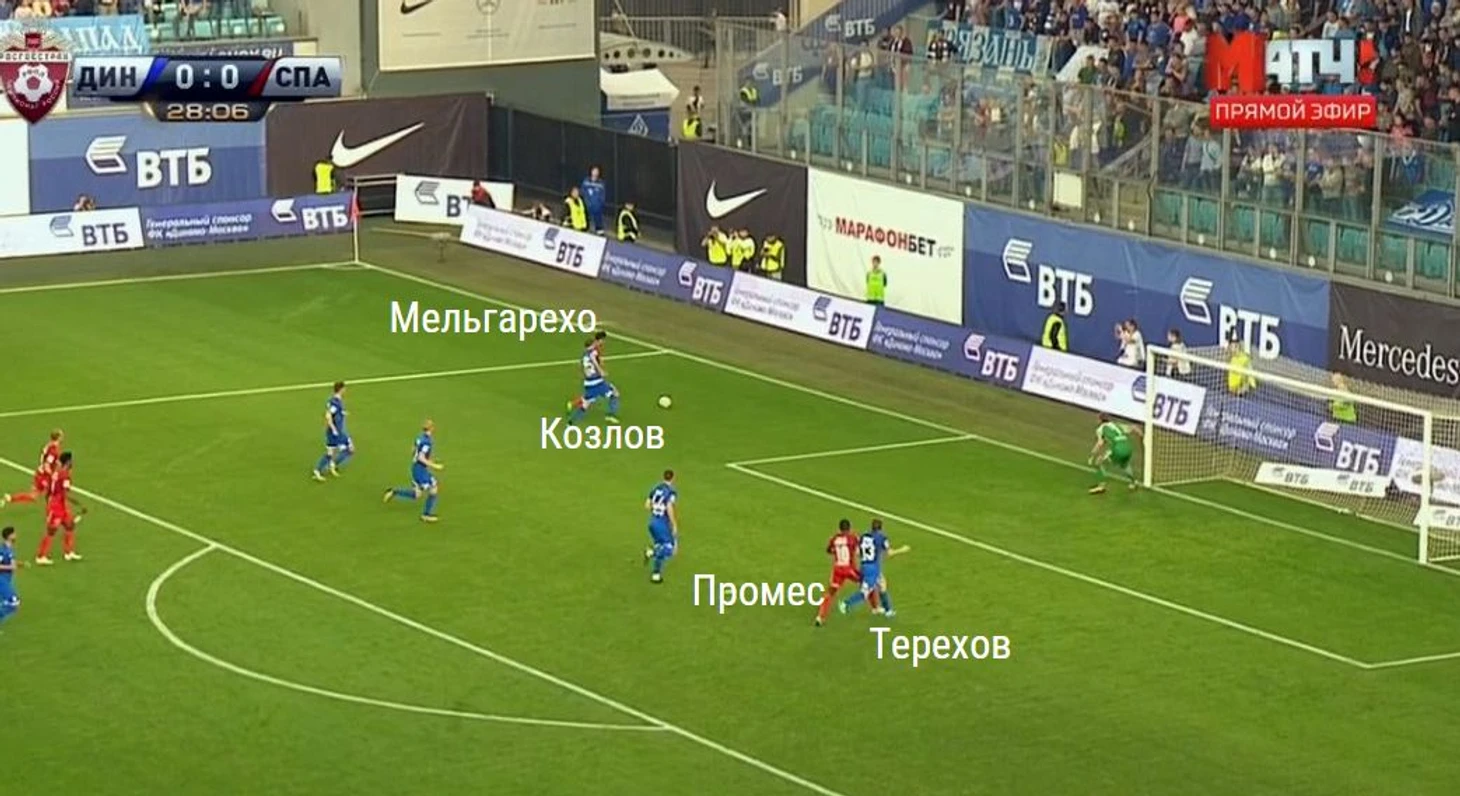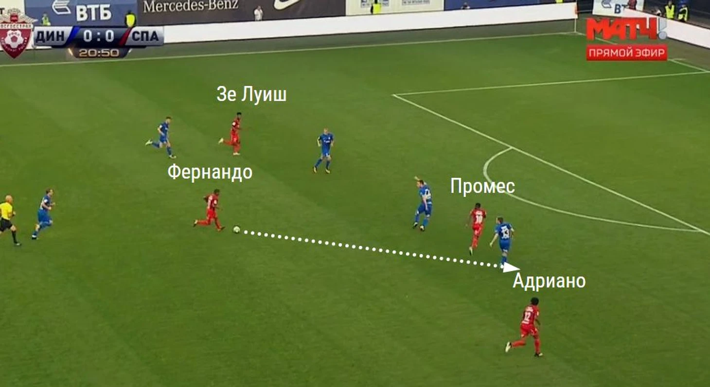 Тем не менее, при позиционных атаках бровки "Спартака" работали неплохо, и Луис Адриано после навеса от Мельгарехо слева на 17 минуте не использовал первый опасный момент у ворот Шунина. На противоположном фланге часто подключался Ещенко, и Промес мог заполнять пустующую зону под нападающими, освобождая пространство для партнера. Так как динамовцы нередко прижимались к линии штрафной в позиционной защите, у голландца порой возникали возможности проявить себя.