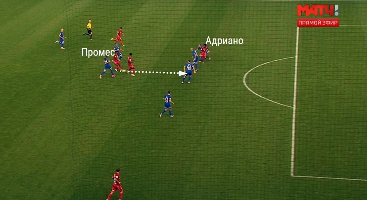 Промес в ответ получил мяч от Мельгарехо и разрезал линию обороны "Динамо" передачей на Луиса Адриано