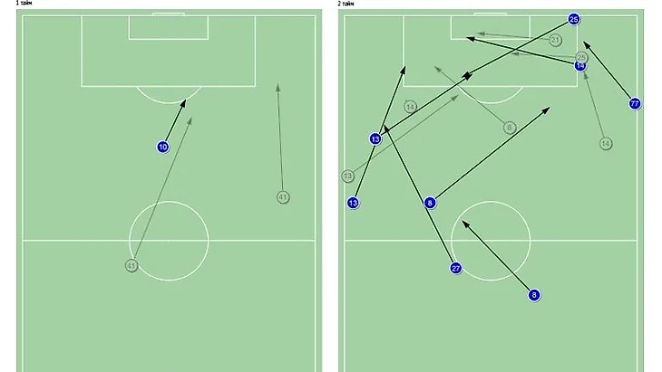 Обостряющие передачи "Динамо" в первом тайме (слева) и во втором. После перерыва виден акцент на фланги.