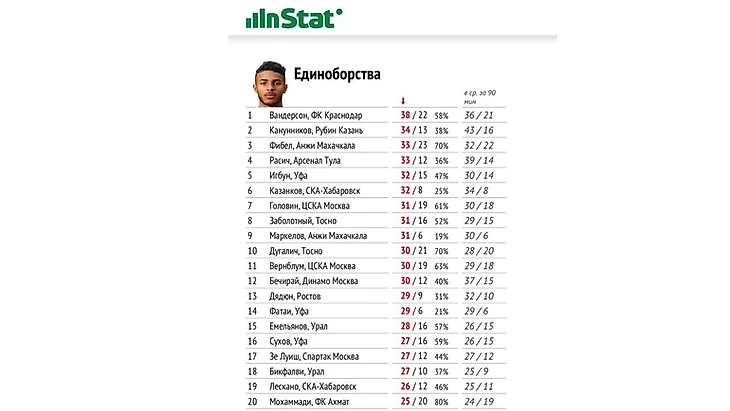 Статистика единоборств Дениса Глушакова в матче "Динамо" - "Спартак". Фото InStat