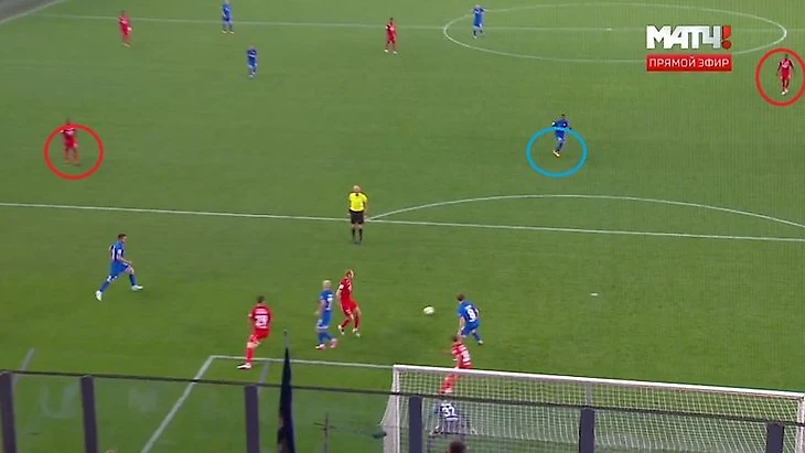 Опасная атака "Динамо" на 48-й минуте. После прострела с фланга Самба Соу оказывается совершенно один, а Промес не помогает партнерам обороняться.