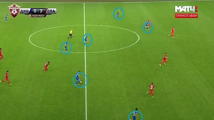 Начало первой голевой атаки "Динамо". После ошибки Глушакова у чужой штрафной возник провал в средней линии, бело-голубые наступают "6 в 4".