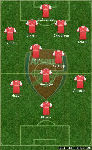 "Арсенал": Фабиански - Санья, Джуру, Скиллачи, Клиши - Сонг, Уилшир, Росицки - Насри, Шамах, Аршавин.