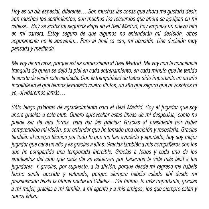 Я покидаю свой дом, ведь именно так я воспринимаю «Реал Мадрид». Я ухожу со спокойным осознанием того, что делал все, что мог, на каждой тренировке, в каждую минуту, пока носил эту футболку. Со спокойным осознанием, что внес и свой вклад в невероятный успех, которого удалось достичь в этом сезоне, когда мы завоевали 4 титула. Год, который мы с вами не забудем никогда…У меня есть только слова благодарности для «Мадрида». Я стал тем, кем являюсь сейчас, только благодаря этому клубу. Я хочу использовать это прощание как повод, чтобы выразить свою благодарность. Спасибо президенту за то, что он понял мое решение и с уважением отнесся к нему. Спасибо тренерскому штабу, ведь благодаря их работе я стал лучше как футболист. Спасибо моим партнерам по команде, с которыми я разделил этот невероятный год. Спасибо всему персоналу клуба, который каждый день старается сделать жизнь игроков немного проще. И, конечно, спасибо болельщикам, выражавшим свою поддержку с момента моего возвращения до последней ночи на «Сибелес»…Еще я хотел бы поблагодарить мою жену, агента и друзей, которые всегда были рядом.