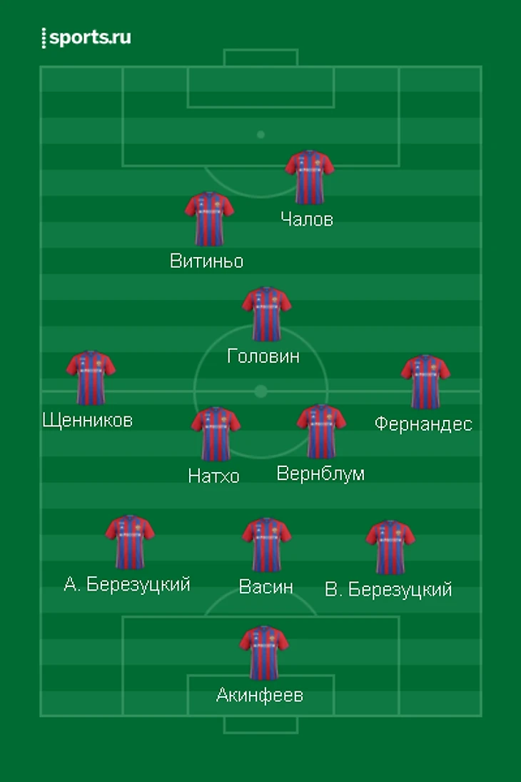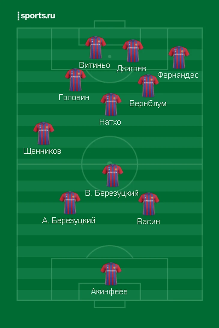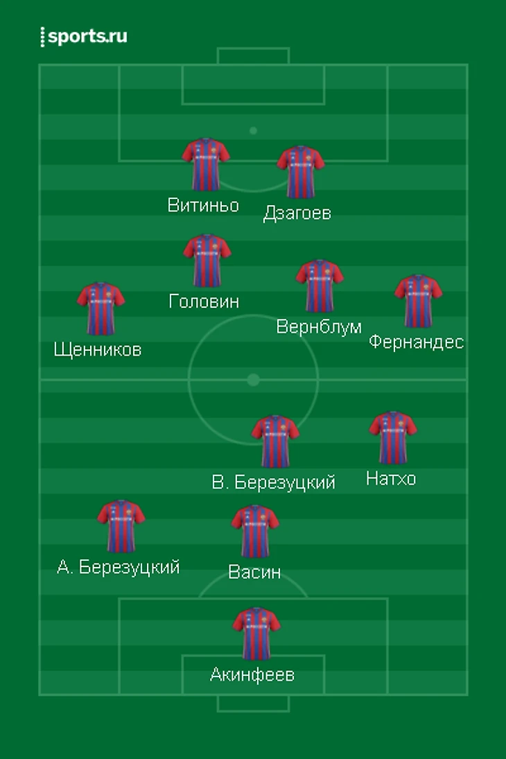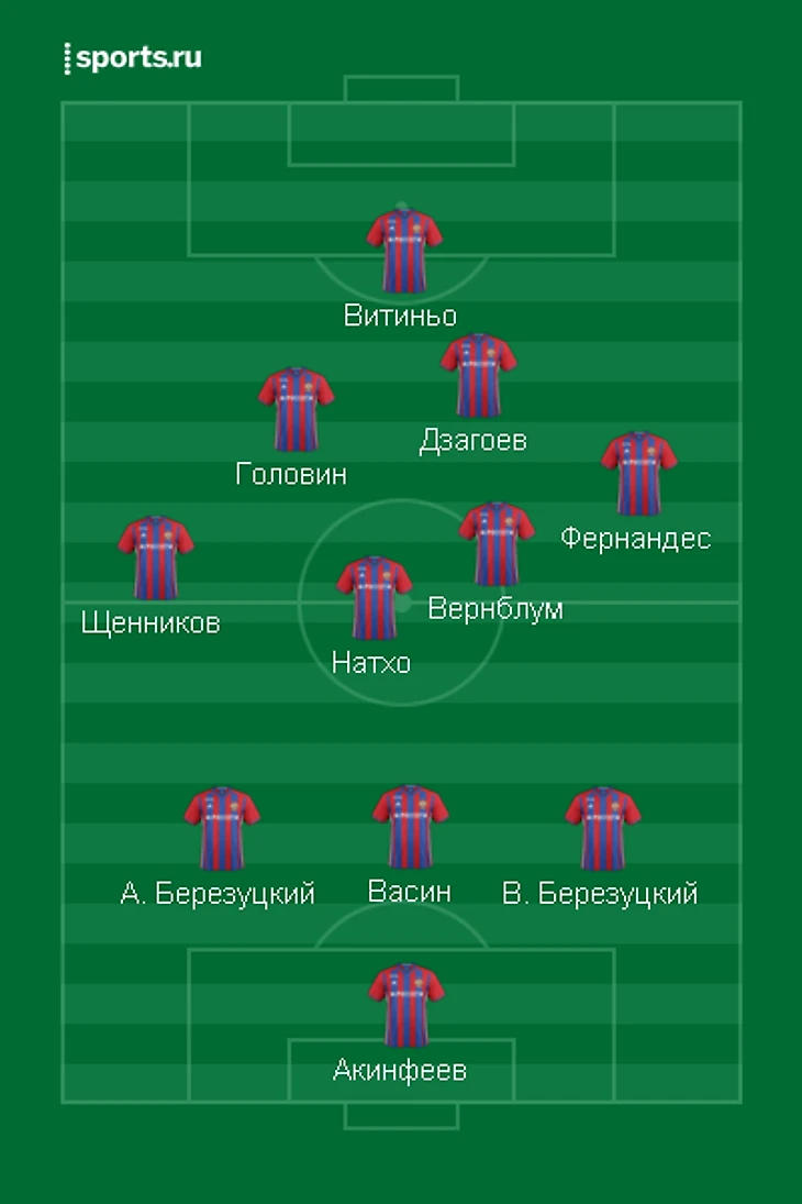 Во-первых, стоит отказаться от порочной идеи выпускать 4 игроков центра поля в схеме 3-5-2. Причем выбирать нужно будет между Натхо (классическим центральным полузащитником с хорошим пасом на разные дистанции) и Дзагоевым (атакующим диспетчером, который всегда готов отдать голевой пас), так как центру поля армейцев нужны, прежде всего, мобильность (Головин) и цепкость (Вернблум). Ещё больше задача упрощается, если принять во внимание, что и Бибрас, и Алан на сегодняшний день не могут отыграть полноценные 90 минут (один никогда не отличался выносливостью, а другой пока физически не может). Окончательное решение будет зависеть от манеры игры соперника (при активном прессинге Алан полезнее, но Бибрас поможет команде лучше держать мяч и контролировать темп игры). Таким образом, впереди восстанавливается связка Чалов-Витиньо, где задачи игроков четко разграничены и каждый занят своим делом.