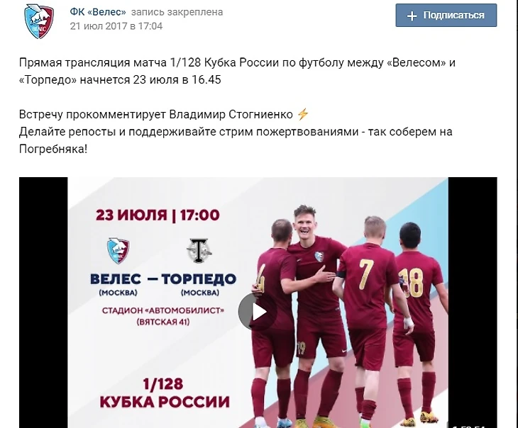 Но за полчаса до игры в Химках на стадионе "Автомобилист" в Москве начался матч 1/128 финала Кубка России, где новичок ПФЛ, то есть второй лиги, московский "Велес" играл с многострадальным и умирающим московским "Торпедо". Автозаводцы выиграли 1:0.