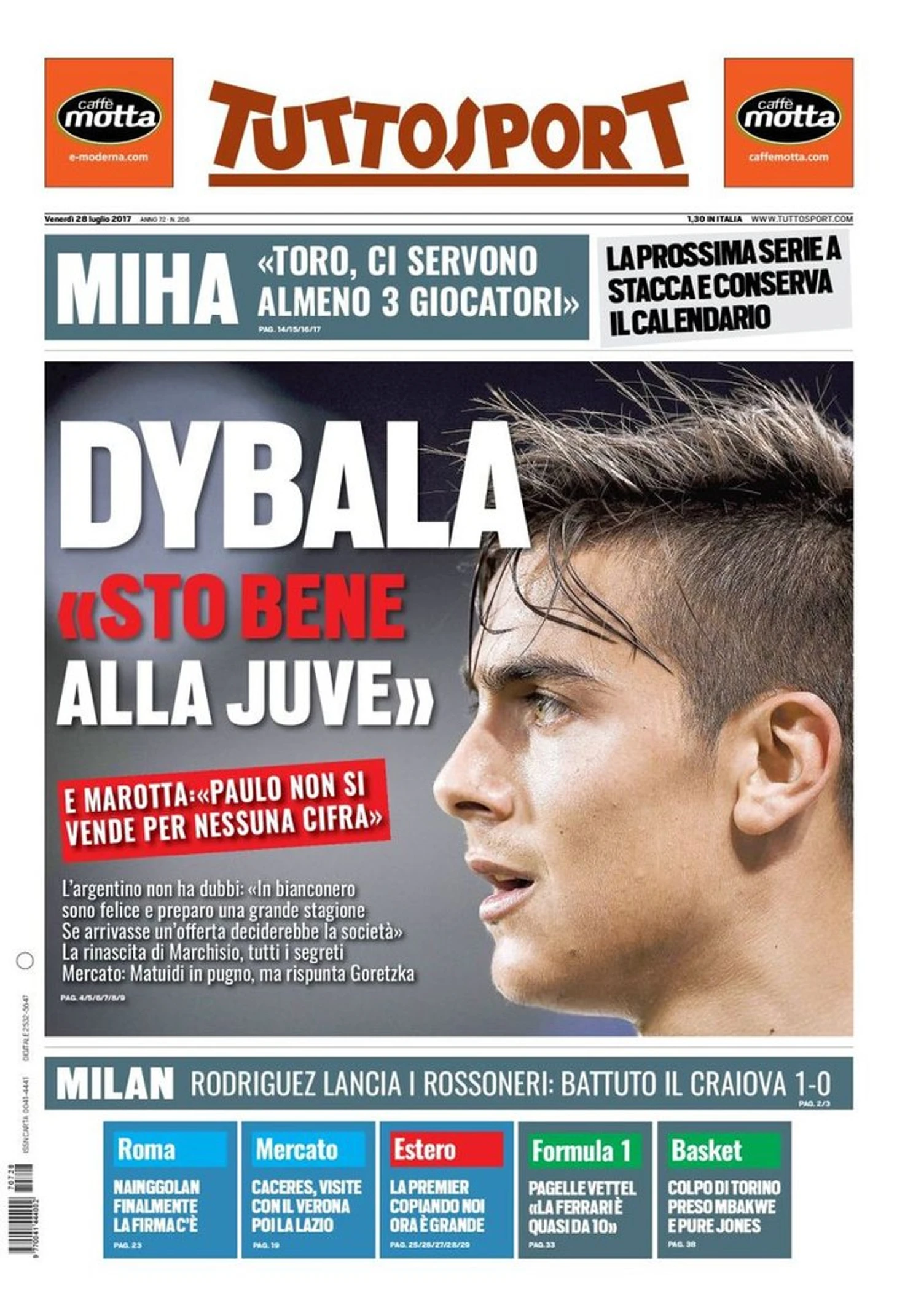И Маротта: «Пауло не продаётся ни за какую сумму». Аргентинец не имеет сомнений: «Я счастлив в составе Бьянконери и готовлюсь к отличному сезону. Если поступит предложение, то решать будет клуб». Возрождение Маркизио, все секреты. Рынок: Матюиди в пасти, но проверка Горетцки.