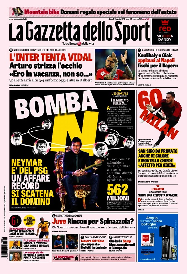 Неймар в «ПСЖ», рекордная сделка приводит к эффекту домино. Общие затраты – 562 миллиона. «Барса» с 222 миллионами клаусулы делает ставку на звезду: Коутиньо, Мбаппе и Ди Мария. Дибала? Он не продаётся.