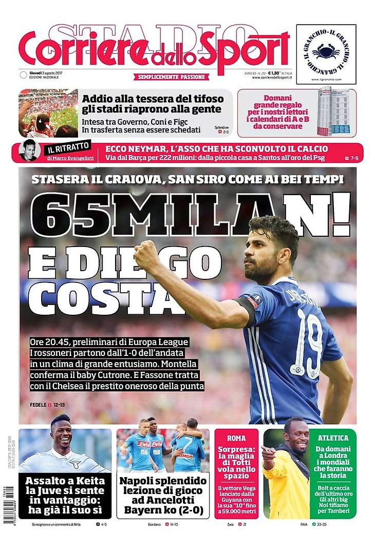 65 тысяч «Милана»! И Диего Коста. Заголовки Gazzetta, TuttoSport и Corriere за 3 августа