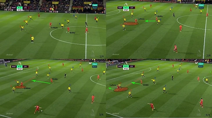 Но вот с игрой без мяча пока туго. Посмотрите на этот момент (чуть более подробное описание) – Лаллана за счет грамотного движения дважды выдергивает соперников и создает разрыв между защитниками, куда бежит Фирмино, и получается опасный момент. Лаллана не касался мяча в финальной трети, но, на мой взгляд, внес решающий вклад в этой атаке. Он никак не будет оценен обычной статистикой. И вот за такими рывками надо смотреть. Конечно, такое движение не всегда попадает в кадр – операторы по понятным причинам фиксируются на мяче, – но тут ничего не поделаешь, правда иногда на помощь приходят широкоугольные камеры (подвешены выше и снимают одним планом, фиксируя всех игроков одновременно), либо камеры из-за ворот.