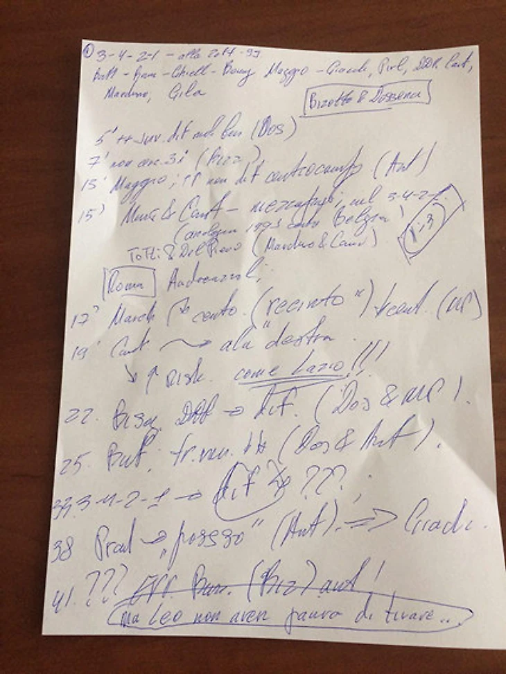 Я действую иначе – записываю абсолютно все, что вижу или слышу по ходу матча: расстановки, тактические перестроения, реплики и вздохи тренеров и комментаторов, реакцию журналистов, зрителей, приходящие в голову идеи, etc. Недавно поймал себя на мысли, что при просмотре футбола испытываю почти физическую боль, если не слышу итальянскую речь. Всегда использую бумагу формата А4 и ручку. На стадионе – карандаш. Если игра содержательная, то исписываю 4-5 листов, которые потом расшифровываю.