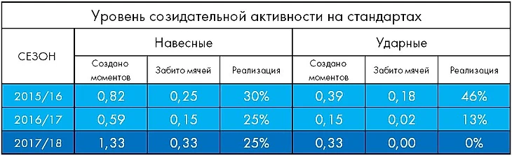 То, что в этом игровом компоненте нужно серьезно прибавлять, показал и прошлый сезон, по итогам которого в активе «Зенита» оказалось только 7 результативных стандартов (без учета пенальти), тогда как в сезоне 2015/16 их было 19. Очевидно, что снижение «стандартных показателей» было напрямую связано с уходом Халка, полноценно заменить которого оказалось некем.
