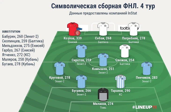 Лучшими клубами 4 тура ФНЛ стали "Зенит-2" и "Енисей" со средним общекомандным рейтингом InStat Index, равным 237 баллам. Худшей же командой стало "Динамо-СПб", набравшее лишь 175 баллов.