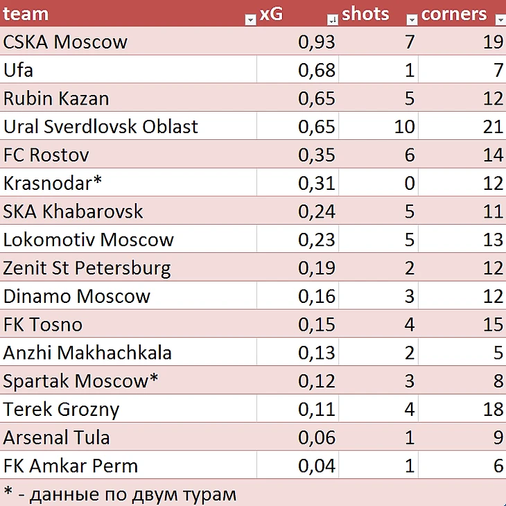 В матче с «Арсеналом» все опасные моменты первого тайма пришли именно с угловых; гол, позволивший казанцам сравнять счет во второй половине матча - оттуда же. Виталий Кафанов, отвечающий в штабе Бердыева за стандартные положения, известен этим еще по прошлому месту работы. «Ростов» - лидеры по КПД со стандартов последние два сезона (первое место по голам в сезоне 16/17, второе - в сезоне 15/16), при том, что по количеству угловых не входил даже в первую десятку. С возвращением в «Рубин» Виталий Витальевич так же демонстрирует свой гений. По итогам трех туров казанская команда снова в лидерах по xG с угловых. Впереди только «ЦСКА» и «Уфа», создавшая всю опасность одним моментом.