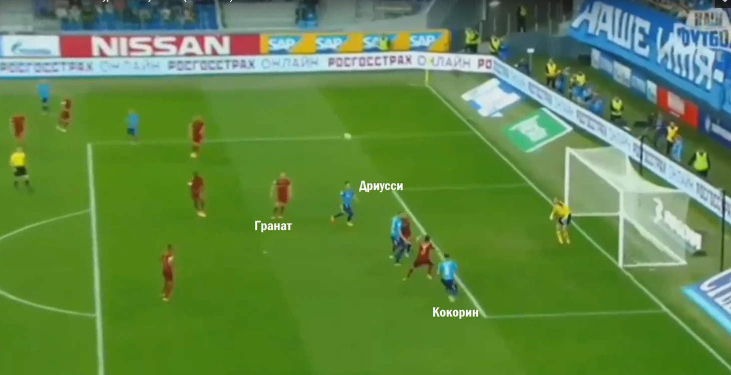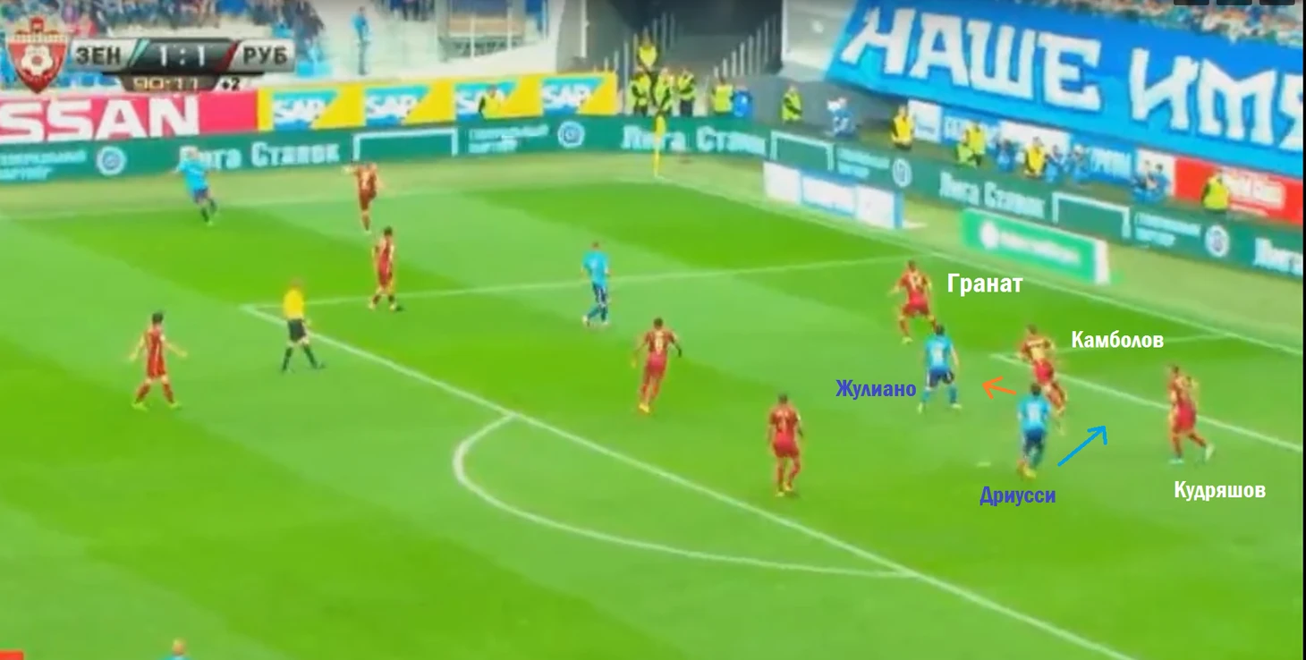 Последние минуты матча. Футболисты «Зенита» активно подают в штрафную. Камболов играет по Жулиано, на Федоре остается опека Дриусси. И если при подаче Руслан накрывает своего футболиста, выдвигаясь к нему крайне плотно, то Кудряшов остается в полупозиции и открывает коридор, в который беспрепятственно врывается аргентинец.