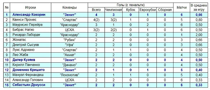 Нападающий "Зенита" Александр Кокорин, положивший начало разгрому "Спартака" в воскресном матче, забил уже 4-й мяч в сезоне и сохранил за собой первую строчку в списке лучших бомбардиров РФПЛ 2017/18. Отметим также, что в Топ-15, кроме Кокорина, входят ещё трое зенитовцев: Себастьян Дриусси, Далер Кузяев и Доменико Кришито, забившие по 2 мяча.