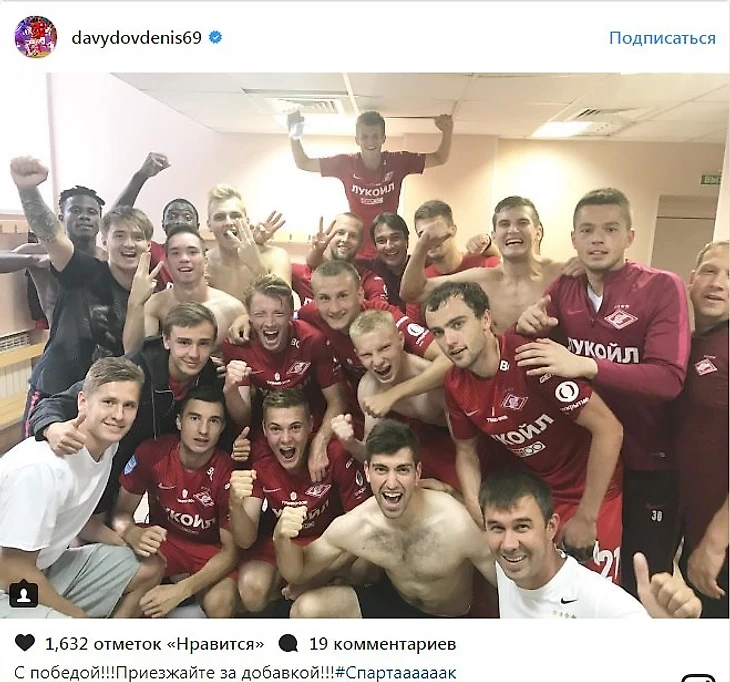 Нападающий «Спартака-2» Денис Давыдов после домашней победы над «Зенитом-2» в матче 7-го тура первенства Футбольной национальной лиги опубликовал командую фотографию из раздевалки