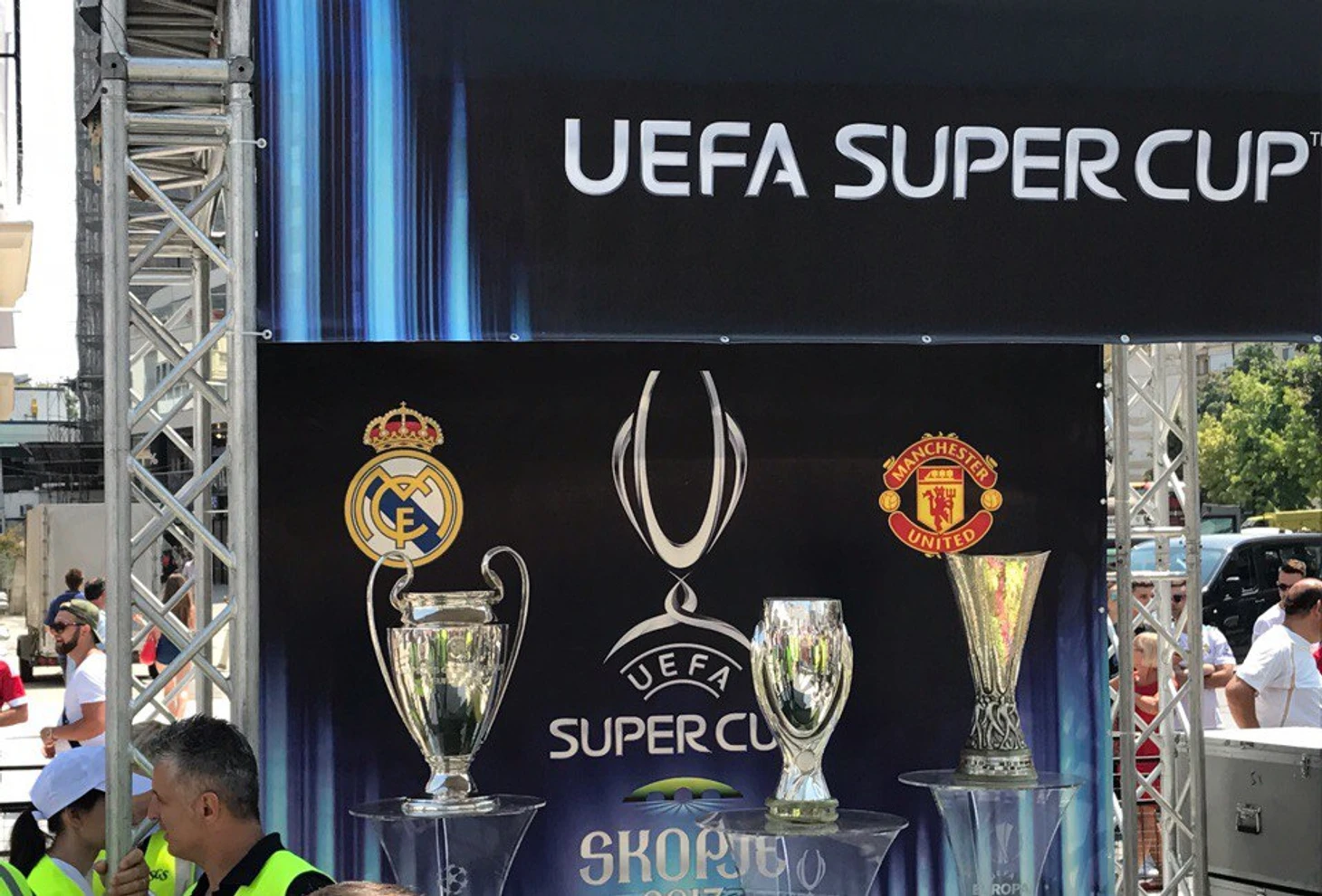 Отдельного внимания заслуживает самый центр Скопье – площадь Македонии. Организаторы устроили фан-зону для болельщиков обоих клубов: с выступлением артистов, большой сценой, фуд-траками и сувенирными точками. Но главное – на площадь выставили все три трофея (кубок Лиги Европы, Лиги Чемпионов, Суперкубок). За фото с чашами можно было простоять до 30 минут (не забываем про палящее солнце и духоту).