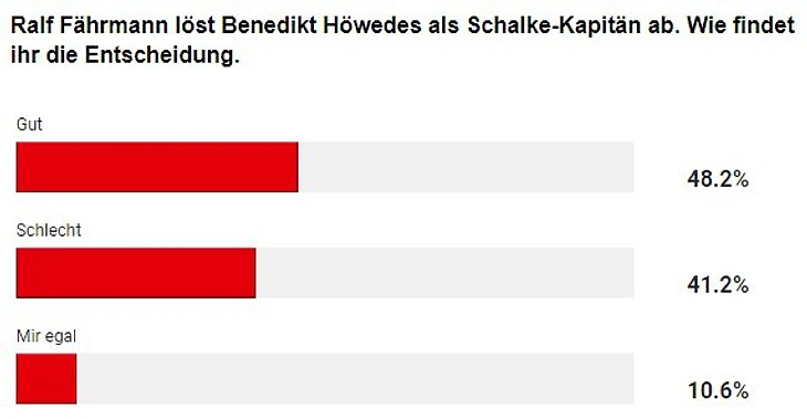 Понятно, что в общей футбольной среде к данному решению Тедеско появилось немало негатива. Но в опросе на сайте рурского портала Reviersport, в котором участие приняло почти 4700 человек (разумеется, значительная часть – болельщики «Шальке»), 48% опрошенных ответили, что хорошо относятся к передаче капитанства Ральфу Ферманну. Плохо оценили этот ход 41% участников опроса. Безраличным это решение оказалось для почти 11% людей.