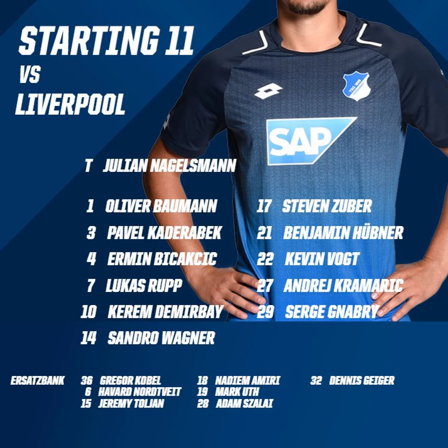 Нагельсманн заменил висящего на карточке Бичакчича, вместо него на поле вышел новичок Хавард Нордвейт, следом в бой был брошен Надим Амири. Поменять расположение дел тренеру не удалось, «Ливерпуль» играл от соперника и успешно сдерживал выпады «Хоффенхайма». В середине второго тайма отдыхать отправился лидер атаки Гнабри, вместо него в игру вошел Марк Ут, отметившийся впоследствии результативным действием.