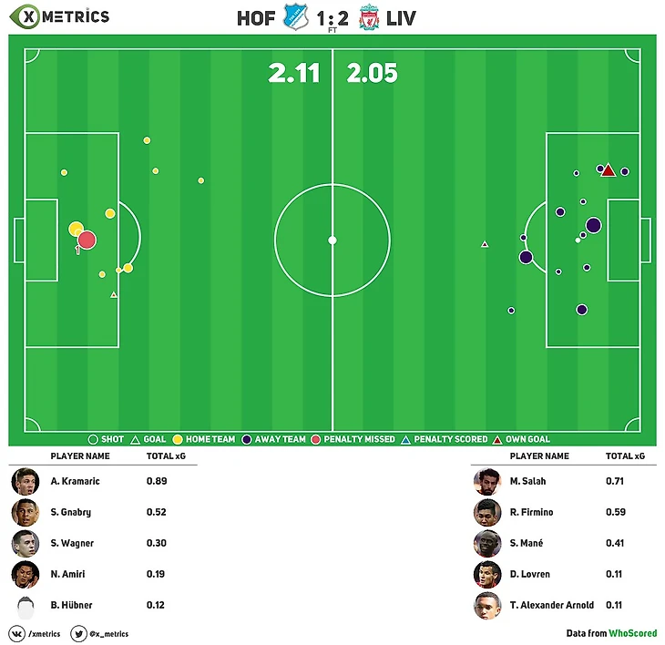 Мнение эксперта. Олег Железнов проект xMetrics:«Обе команды в первом тайме достаточно плохо создавали более-менее опасные моменты, «Ливерпуль» из DZ нанес два удара – один заблокирован, второй после углового головой – достаточно жиденько. «Хоффенхайм» только под конец тайма создал более-менее приличный момент с игры на 0.49 xG. Незабитый пенальти, конечно, аукнулся, дома надо забивать максимально много. До перерыва, на мой взгляд, были чистые качели, причем без особых подходов к воротам. Во второй же половине «Хоффенхайм», по сути, так и не смог создать значимых моментов с игры. Но на самом деле, и у «Ливерпуля» была похожая ситуация. С игры в DZ немцы создали 0.78 xG, а англичане – 0.77. По большому счету, игру решили две детали: незабитый одиннадцатиметровый и шальной штрафной Арнольда. Ответный матч должен быть очень и очень интересным.