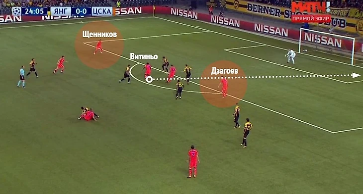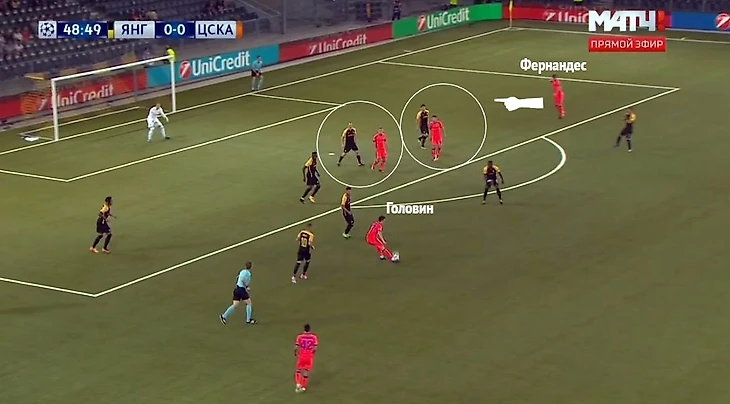 Игроки ЦСКА также старались делать ставку на подбор мяча на чужой половине поля и на поиск вариантов для пред- и последнего паса между линиями "Янг Бойз". В целом, защита швейцарской команды располагалась высоко, крайние защитники часто не успевали вернуться (либо раньше времени старались убежать в контратаку, которая могла и не случиться), в результате чего в центре обороны у хозяев создавался некий квадрат 2+2 из центрбеков и опорников, а между ними и за ними - пространство, которым, к слову, армейцы пользовались слабо.