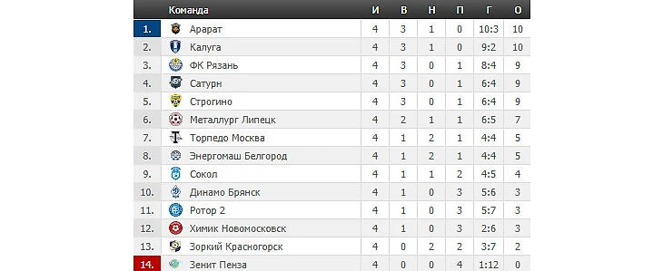 «Калуга» - главный сюрприз старта сезона со знаком плюс. В четырёх турах команда Виталия Сафронова одержала три победы и сыграла вничью на выезде с «самим» «Араратом» - 2:2. Калужане по праву считаются домашним коллективом. Выиграли они с одинаковым счётом 1:0 и два поединка на своём поле нынешнего сезона – у «Ротора-2» и «Химика», однако оба раза забивали победные мячи под самый занавес встреч. Да и к очень серьезным соперникам клубы из Волгограда и Новомосковска не отнесёшь.