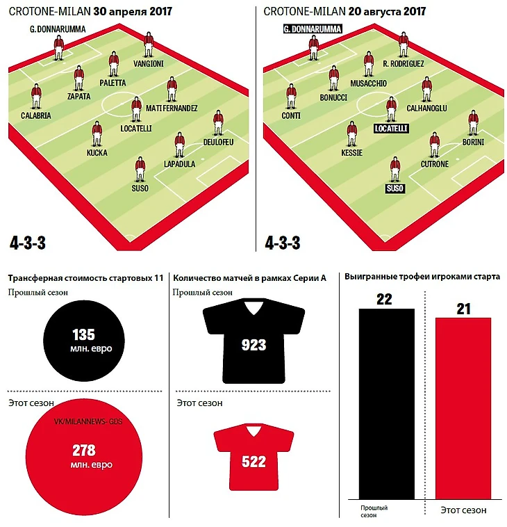 ● Инфографика: La Gazzetta dello Sport сравнивает трансферную стоимость 11 игроков стартового состава, количество сыгранных матчей в Серии А и выигранные трофеи сейчас, а также в апреле 2017 года, когда «Милан» играл против «Кротоне».
